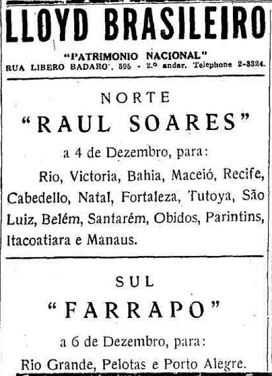 Lloyd Brasileiro - navios Farrapo e Raul Soares Publicado no jornal O Estado de São Paulo em 3 de dezembro de 1940, página 13 (Acervo Estadão)