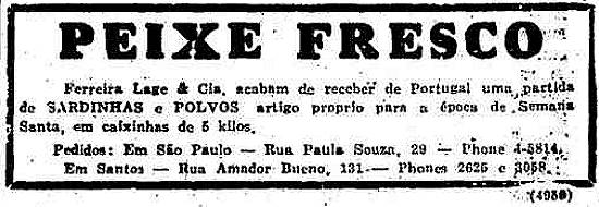 "Peixe Fresco": Ferreira Lage & Cia. - importadores de sardinhas e polvos para Semana Santa Publicado no jornal O Estado de São Paulo em 15 de março de 1940, página 9 (Acervo Estadão)