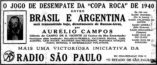 Radio São Paulo, em colaboração com O Estado de São Paulo - jogo de desempate da Copa Roca de 1940 (Brasil/Argentina) - em rede com várias emissoras, como a Rádio Atlântica de Santos Publicado no jornal O Estado de São Paulo em 17 de março de 1940, página 13 (Acervo Estadão)