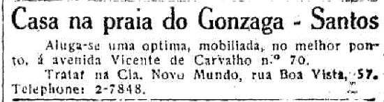 Cia. Novo Mundo - aluga casa na praia do Gonzaga, em Santos Publicado no jornal O Estado de São Paulo em 12 de julho de 1940, página 9 (Acervo Estadão)