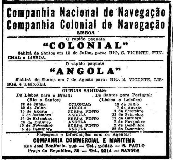Cia. Commercial e Maritima - agentes de Companhia Nacional de Navegação e da Companhia Colonial de Navegação, de Lisboa (Portugal) Publicado no jornal O Estado de São Paulo em 12 de julho de 1940, página 9 (Acervo Estadão)
