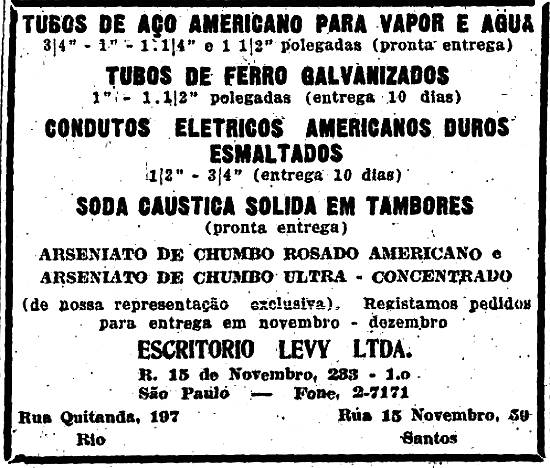 Escritório Levy Ltda. - Tubos, condutos elétricos, soda cáustica, arseniato de chumbo