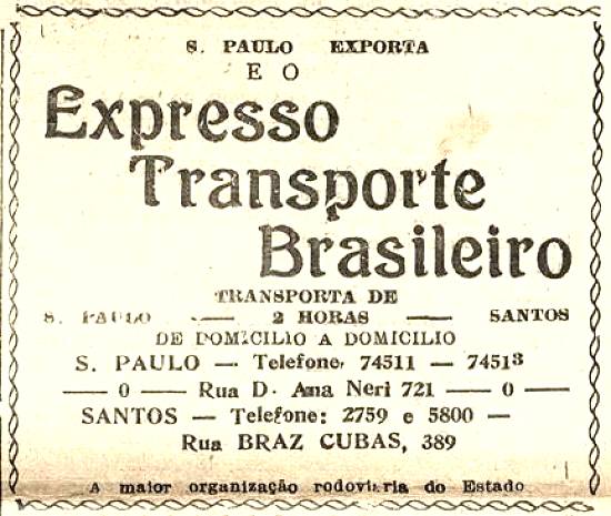 "São Paulo exporta e o Expresso Transporte Brasileiro transporta" - de S. Paulo a Santos em duas horas - A maior organização rodoviária do Estado"