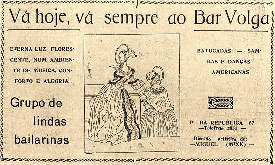 "Vá hoje, vá sempre ao Bar Volga - Eterna luz fluorescente, num ambiente de música, conforto e alegria - Grupo de lindas bailarinas - Batucadas - Sambas e danças americanas - Praça da República, 87 - Direção artística de Miguel (Mixk)"