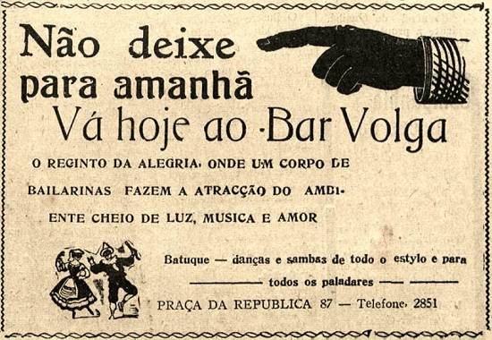 "Não deixe para amanhã - Vá hoje ao Bar Volga - O recinto da alegria, onde um corpo de bailarinas faz a atração do ambiente cheio de luz, música e amor - Batuque - danças e sambas de todo o estilo e para todos os paladares - Praça da República, 87"