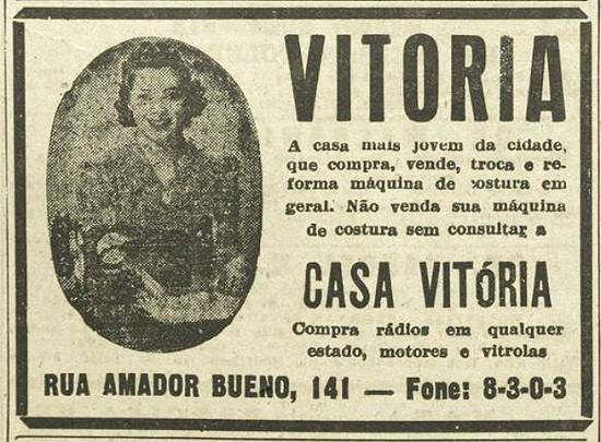 Casa Vitória, na Rua Amador Bueno, 141 - "A casa mais jovem da cidade, que compra, vende, troca e reforma máquinas de costura em geral (...) Compra rádios em qualquer estado, motores e vitrolas"