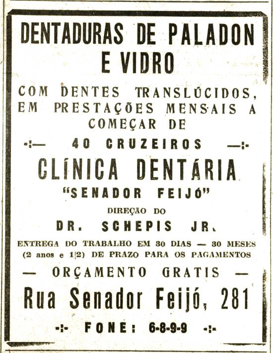 Clínica Dentária "Senador Feijó", do dr. Schepis Jr., na Rua Senador Feijó, 281: "Dentaduras de paladon e vidro, com dentes translúcidos (...) - Entrega do trabalho em 30 dias - 30 meses de prazo para os pagamentos"