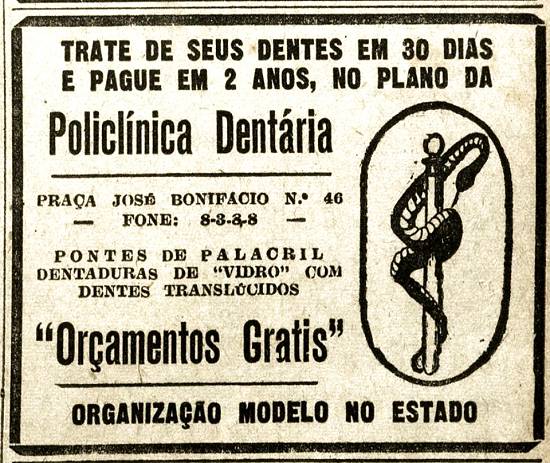 Policlínica Dentária, na Praça José Bonifácio, 46, "Organização modelo no Estado" - "Trate seus dentes em 30 dias e pague em 2 anos (...) - Pontes de palacril, dentaduras de 'vidro' com dentes translúcidos"
