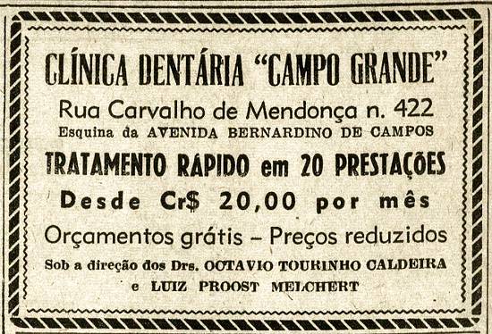 Clínica dentária "Campo Grande", na Rua Carvalho de Mendonça, 422, sob a direção dos drs. Octavio Tourinho Caldeira e Luiz Proost Melchert: "Tratamento rápido em 20 prestações"