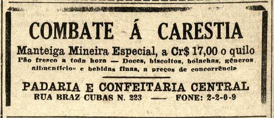 Padaria e Confeitaria Central, na Rua Braz Cubas, 223: "Combate à carestia: Manteiga mineira especial, a CR$ 17,00 o quilo (...) - Doces, biscoitos, bolachas, gêneros alimentícios e bebidas finas, a preços de concorrência"