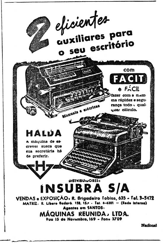Insubra S.A./Máquinas Reunidas Ltda. - máquina de escrever Halda e de calcular Facit