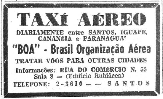 Brasil Organização Aérea (BOA) - táxi aéreo - ligação diária com Iguape, Cananéia e Paranaguá