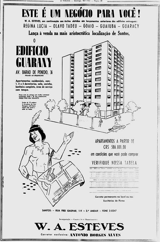 W.A.Esteves - Incorporação, Construção, Financiamento "lança à venda na mais aristocrática localização em Santos, o Edifício Guarany - Av. Barão de Penedo, 36, pegado ao Orquidário"