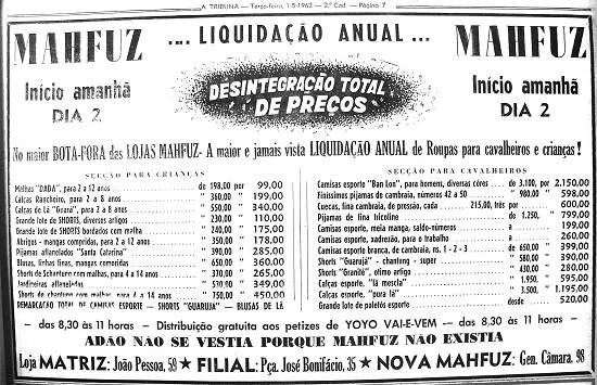 Lojas Mahfuz anunciam/ um fato sensacional/ um grande acontecimento/ a liquidação anual.[1]
