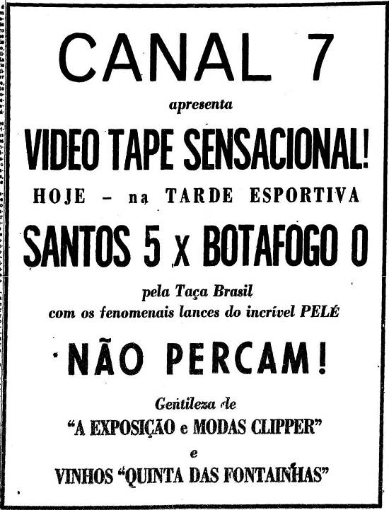 Canal 7 de televisão/A Exposição/Modas Clipper/Vinhos "Quinta das fontainhas" - tarde esportiva com videotape do jogo Santos 5 x 0 Botafogo pela Taça Brasil, com jogador Pelé