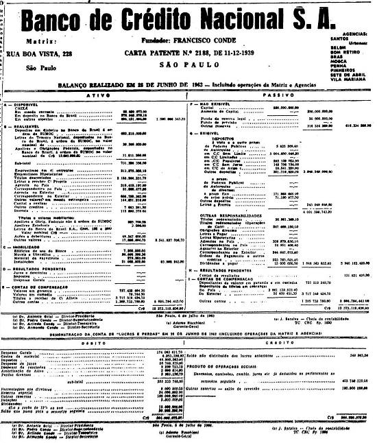 Banco de Crédito Nacional S.A. (BCN) - com agência em Santos - balanço de junho de 1963
