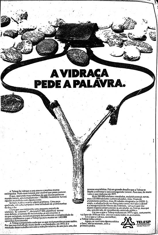 A Telesp compreende e sabe que os que reclamam têm as suas razões. Por isso tem trabalhado muito desde a sua fundação, em 1973. E o resultado desse trabalho tem sido a redução relativa, de ano para ano, das pessoas insatisfeitas. Foi um grande desafio que a Telesp se dispôs a enfrentar e está conseguindo vencer. Para isso, de muito valeu o que realizou em 1977.