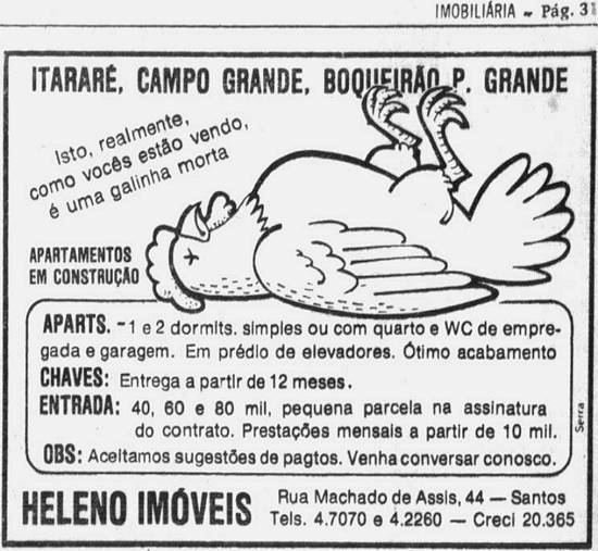Heleno Imóveis (Itararé, Campo Grande, Boqueirão, Praia Grande): "Isto, realmente, como vocês estão vendo, é uma galinha morta" [Significado de 'galinha-morta' por Hugo Marconi Ribeiro (PB) em 8/5/2011: "diz-se de uma casa, imóveis e outros artigos de valor sendo oferecidos por um valor bem abaixo do valor real ou de mercado. Exemplo: 'Procure nos classificados para ver se encontra alguma galinha-morta que possa comprar com este dinheiro.']