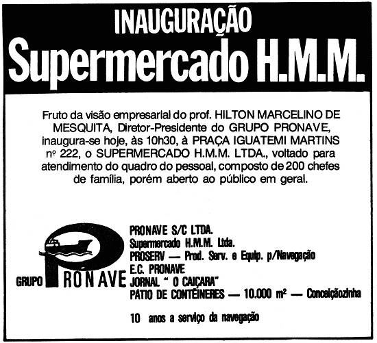 Grupo Pronave - inauguração do Supermercado H.M.M. Ltda. Reproduzido do jornal santista A Tribuna, de 22 de dezembro de 1984, página 21