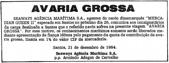 Seaways Agência Marítima S.A. - anúncio padrão de Avaria Grossa de carga marítima Reproduzido do jornal santista A Tribuna, de 22 de dezembro de 1984, página 21