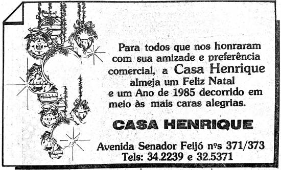Casa Henrique - autopeças - mensagem natalina Publicado no jornal santista A Tribuna, de 24 de dezembro de 1984, página 20