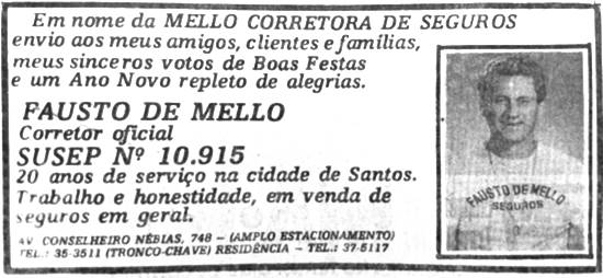 Mello Corretora de Seguro - corretor Fausto de Mello - mensagem natalina Publicado no jornal santista A Tribuna, de 24 de dezembro de 1984, página 20