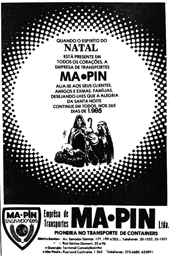 Empresa de Transportes Ma-Pin Ltda. - mensagem natalina Publicado no jornal santista A Tribuna, de 24 de dezembro de 1984, página 19