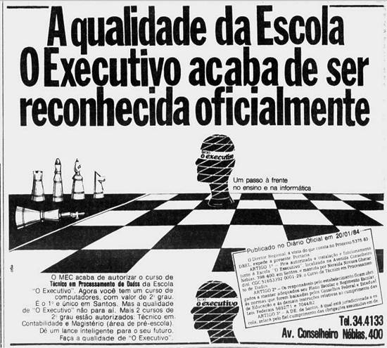 Escola O Executivo, mantida por Neide Morais Gerardini na Av. Conselheiro Nébias, 398/400, foi autorizada a instalar o curso de Técnico em Processamento de Dados, pelo Ministério da Educação e Cultura (MEC), conforme publicação no Diário Oficial em 20/1/1984