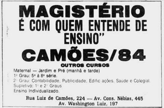 Escola Luiz de Camões, com unidades na Rua Luiz de Camões, 224, avenidas Conselheiro Nébias, 445 e Washington Luiz, 197 e cursos Maternal - Jardim e Pré; Ensino Fundamental da 5ª à 8ª séries e 2º grau profissionalizante, além de Supletivo de 1º e 2º graus e ensino individualizado