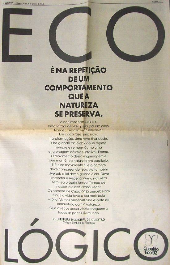 Publicado no jornal santista A Tribuna em 3 de junho de 1992, na página 3 do suplemento especial Caderno Ecológico - Conferência Rio-92
