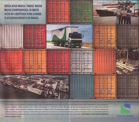 "A Santos Brasil, maior operadora de contêineres do país, agora está representada por uma marca única. A empresa controla três terminais localizados em pontos estratégicos da costa brasileira: o Tecon de Santos (SP), o Tecon Imbituba (SC) e o Tecon Vila do Conde (PA), além do Terminal de Veículos do Porto de Santos. Com a Santos Brasil Logística, oferece soluções de logística a seus clientes. Listada no nível 2 de governança corporativa da Bovespa, a empresa mantém investimentos contínuos em qualificação de mão-de-obra e tecnologia. Promove educação profissional para jovens das comunidades onde atua e alinha-se com boas práticas de preservação ambiental. Por acreditarmos em inovação contínua e na busca de excelência em todas as disciplinas onde atuamos é que vamos sempre além. Santos Brasil, muito além do contêiner. www.santosbrasil.com.br"