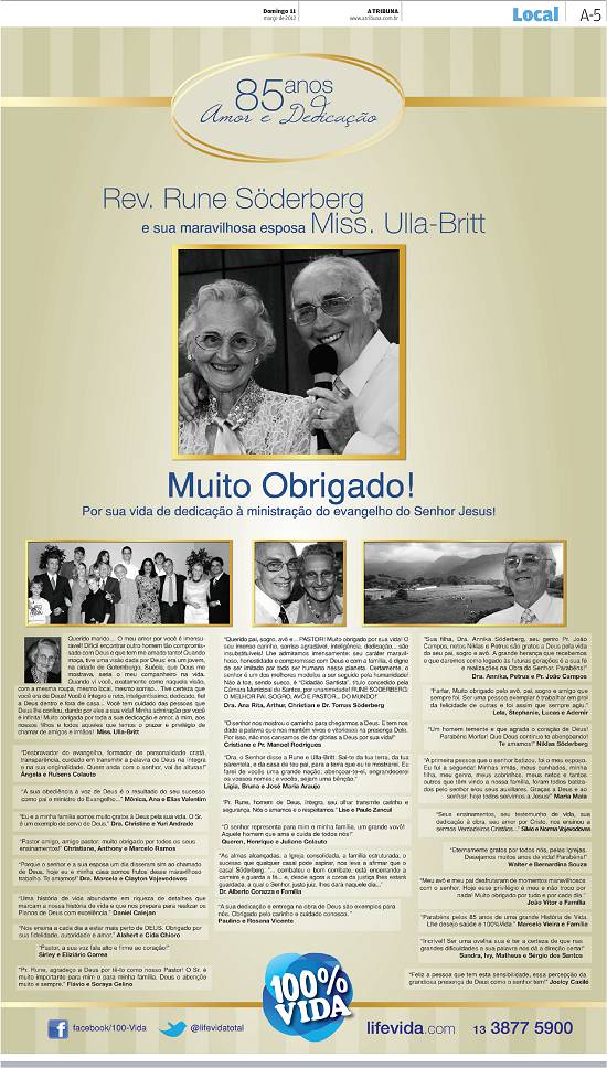 Igreja 100% Vida - 85 anos do reverendo Rune Söderberg e esposa Ulla-Britt