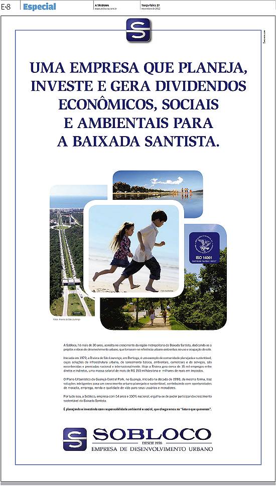 SoBLoco Empresa de Desenvolvimento Urbano - primeiro de série de anúncios semelhantes publicados em cadernos especiais sobre desenvolvimento das cidades da Baixada Santista: