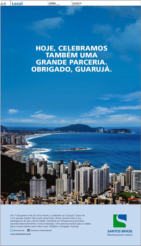Anúncio no jornal A Tribuna, caderno especial São Vicente, em 22 de janeiro de 2013, página 9