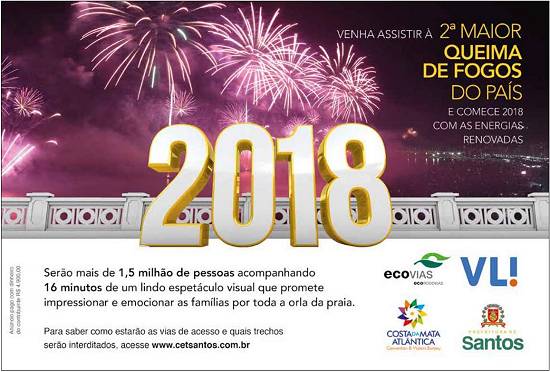 Em Santos a 2ª maior queima de fogos do País, pela passagem de ano - Costa da Mata Atlântica Convention & Visitors Bureau/Prefeitura de Santos/Ecovias-Ecorodovias/Valor da Logística Integrada (VLI)