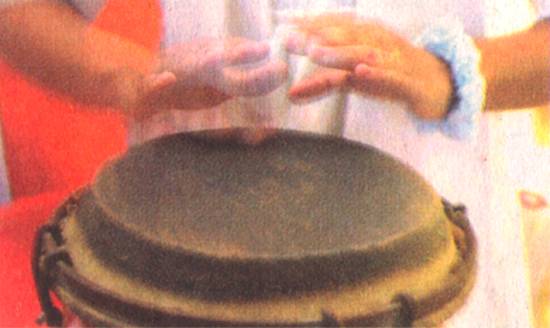 De modo cadenciado, em um ritmo próximo ao lundu, os atabaques são percutidos pelas habilidosas mãos dos Ogãs (responsáveis pela parte rítmica dos rituais da Umbanda Bantu). Acompanhados por um coro de melodias simples e letras que exaltam os orixás e os santos católicos, eles anunciam o início da sessão de incorporação da falange dos Pretos-velhos - de acordo com os credos da Umbanda, são espíritos sábios e benevolentes que auxiliam todos que buscam sua ajuda.