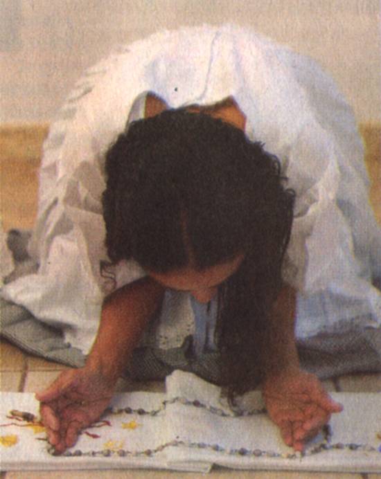 No terreiro (local das cerimônias religiosas), em duas filas paralelas, cerca de 20 médiuns, vestidos de roupas brancas, cantam em saudação aos espíritos. Logo após, deitam-se diante do gongá e, como uma demonstração de devoção e respeito, expõem aos santos, anjos e orixás que estão dispostos a servi-los, como instrumento carnal. No final do rito, alguns estremecem, erguem e vibram as mãos emitindo sons discretos. Outros curvam a coluna cervical, andam com dificuldade arrastando os pés e resmungando para si, como se fossem pessoas idosas, com dificuldade de locomoção.