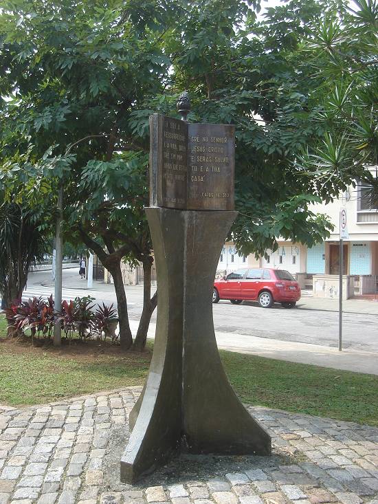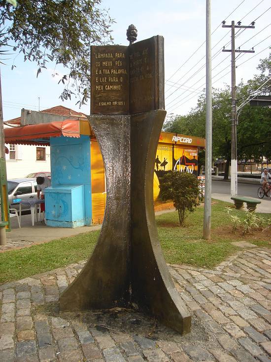 Estátua localizada na Praça da Bíblia, na Vila Belmiro, defronte à Avenida Pinheiro Machado. Tem três faces, com dois versículos bíblicos em cada uma: