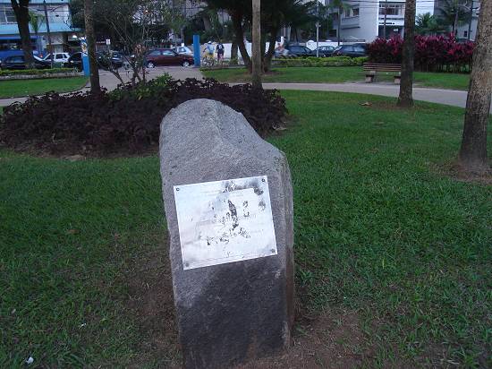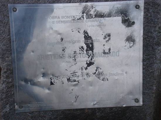 Aristides Bastos Machado (prefeito municipal em 1936) - homenagem da cidade por estes jardins". A placa tem a data de 19 de maio de 1991 e a marca da