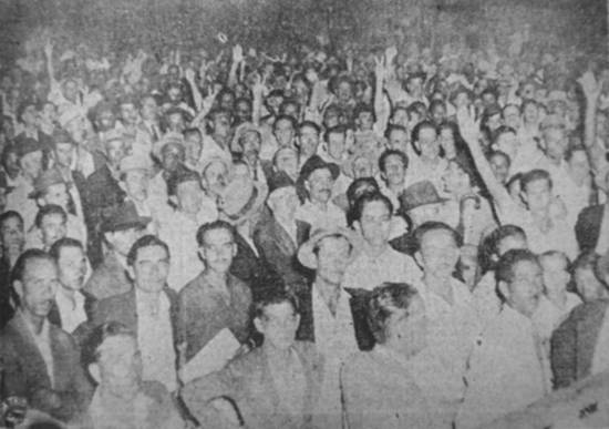 Proletariado Santos reunido praça pública através comício União Geral Sindicatos Trabalhadores Santos, integrada 37 Sindicatos representando mais 50