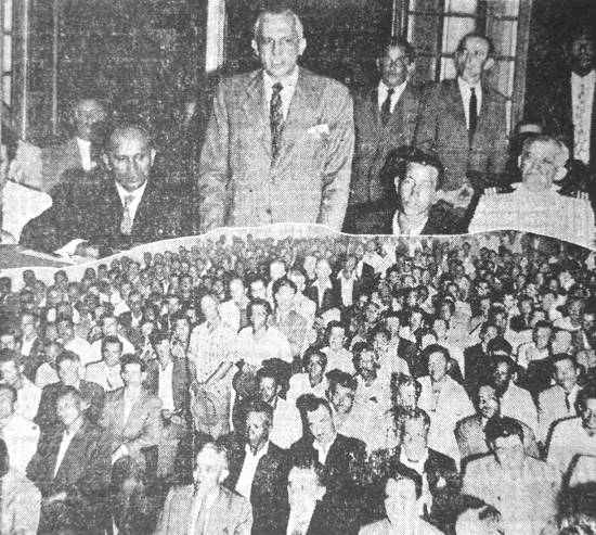 vendo-se em cima o dr. Hilton dos Santos, presidente do IAPETC, quando se dirigia aos estivadores, e, em baixo, parte da numerosa assistência