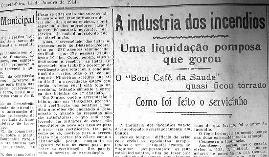 No ano em que começaria a Primeira Guerra Mundial, Santos e o Brasil atravessavam uma fase de crise econômica. Empresários, vendo avizinhar-se a ruína, começaram a usar o expediente de contratar vultosos seguros para as instalações de suas empresas e, logo em seguida, provocar o sinistro para receber a quantia segurada. Com a conivência de seguradoras que, mais interessadas em vender as apólices, pagavam antes mesmo que fosse feito o inquérito para apurar as causas do incêndio. Como as fraudes eram preparadas com bem pouca habilidade, e de forma muito constante, logo chamaram a atenção das autoridades, como nos casos registrados pelo jornal santista A Tribuna, em 14 de janeiro de 1914 (página 3 - ortografia atualizada nesta transcrição; 'muscara' = escafedera, fugira; 'cobrinho' = moeda de cobre de baixo valor; 'pataca' = antiga moeda de baixo valor; 'pinola' = farsa):