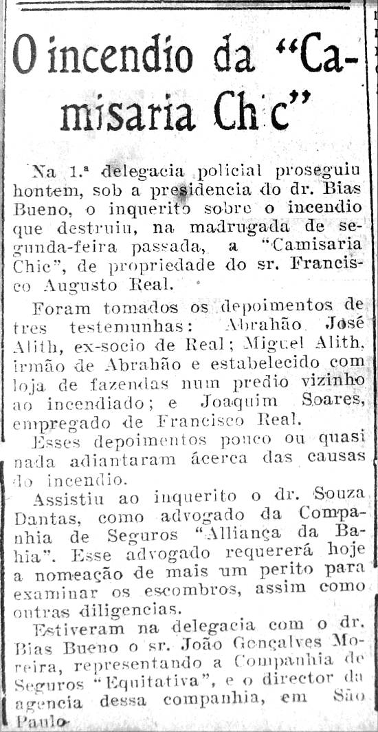 Na 1ª delegacia policial prosseguiu ontem, sob a presidência do dr. Bias Bueno, o inquérito sobre o incêndio que destruiu, na madrugada de segunda-feira passada, a Camisaria Chic, de propriedade do sr. Francisco Augusto Real.