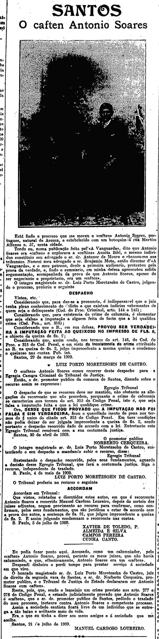 Tendo eu, numa publicação feita pel'A Vanguarda, dito que Antonio Soares era cafetão e explorava a cafetina Annita Blid, o mesmo indivíduo constituiu seu advogado o sr. dr. Antenor de Moura e chamou-me aos tribunais. Nomeei meu advogado o sr. Benjamin Mota, então diretor d'A Vanguarda, e o meu patrono, desde a primeira audiência, protestou pela prova da verdade, e, findo o sumário, em minha defesa apresentou sólida argumentação, acompanhada da prova de que Antonio Soares, apesar de ser negociante e proprietário, era um cafetão.