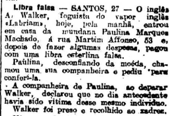 Libra falsa - Santos, 27 - O inglês A. Waler, foguista do vapor inglês Labriam, hoje, pela manhã, entrou em casa da mundana Paulina marques Machado, à Rua Martim Affonso, 53, e, depois de fazer algumas despesas, pagou com uma libra esterlina falsa.