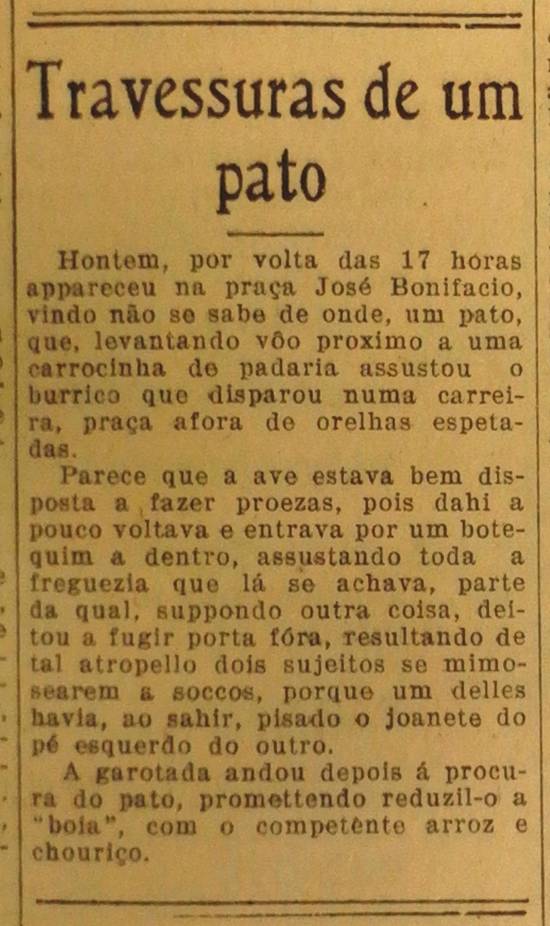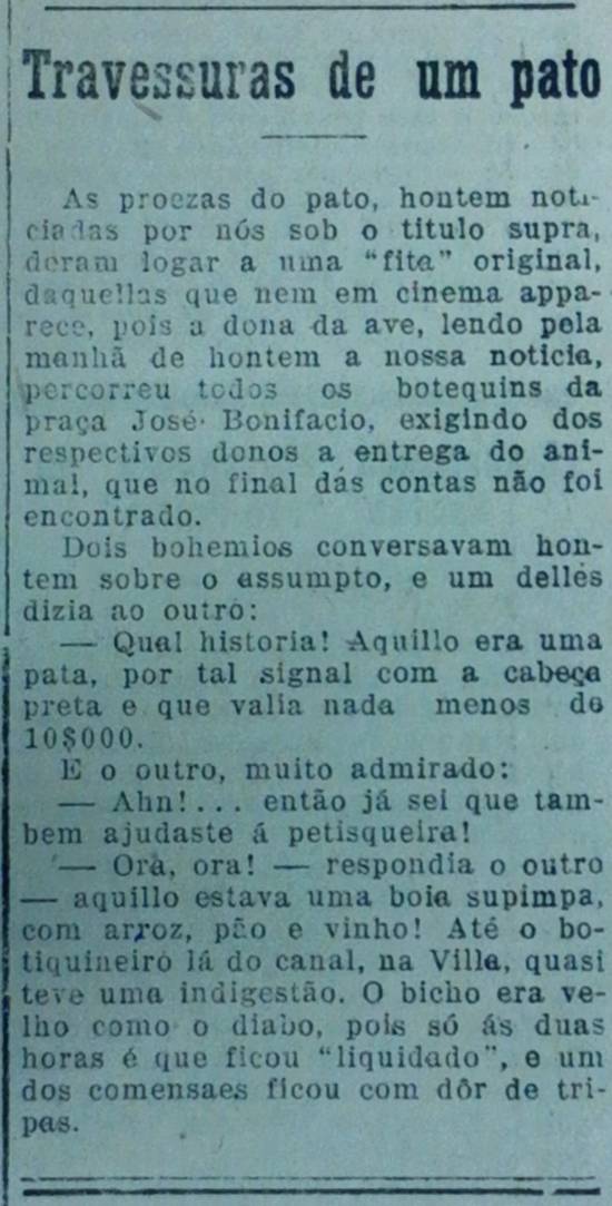 As proezas do pato, ontem noticiadas por nós sob o título supra, deram lugar a uma "fita" original, daquelas que nem em cinema aparece, pois a dona da ave, lendo pela manhã de ontem a nossa notícia, percorreu todos os botequins da Praça José Bonifácio, exigindo dos respectivos donos a entrega do animal, que no final das contas não foi encontrado.