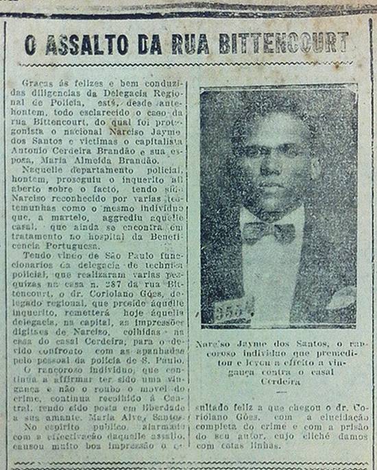 Graças às felizes e bem conduzidas diligências da Delegacia Regional de Polícia, está, desde anteontem, todo esclarecido o caso da Rua Bittencourt, do qual foi protagonista o nacional Narciso Jayme dos Santos e vítimas o capitalista Antonio Cerdeira Brandão e sua esposa, Maria Almeida Brandão.