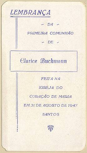 Cartão nacional pela primeira comunhão de Clarice Buchmann na Igreja do Coração de Maria, em 31 de agosto de 1947. Coleção Francisco Carballa