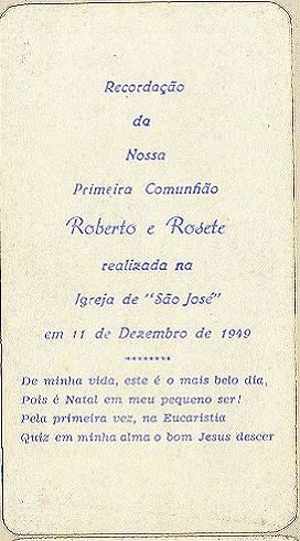 Cartão norte-americano pela primeira comunhão de Roberto e Rosete, na Igreja de São José, em 11 de dezembro de 1949. Coleção