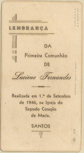 Cartões estadunidenses para 1ª comunhão (Superior/E): de Luciene Fernandes em 1º de setembro de 1945, na Igreja do Sagrado Coração de Maria e